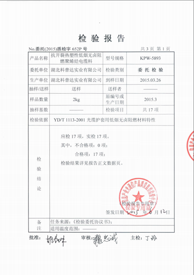 科普達產品主要有各種光纜護套料,榮獲湖北省名牌產品,守合同重信用企業。 榮獲多種國家資質認證包括:ISO9001質量管理體系認證、ISO14001環境管理體系及OHSAS18001職業健康安全管理體系認證。...